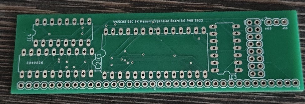 A PCB for an 8K Static RAM expansion for the HobbyPCB 65C02 SBC. The board can be addressed at any of the 8 × 8K blocks in the full 64K address space.